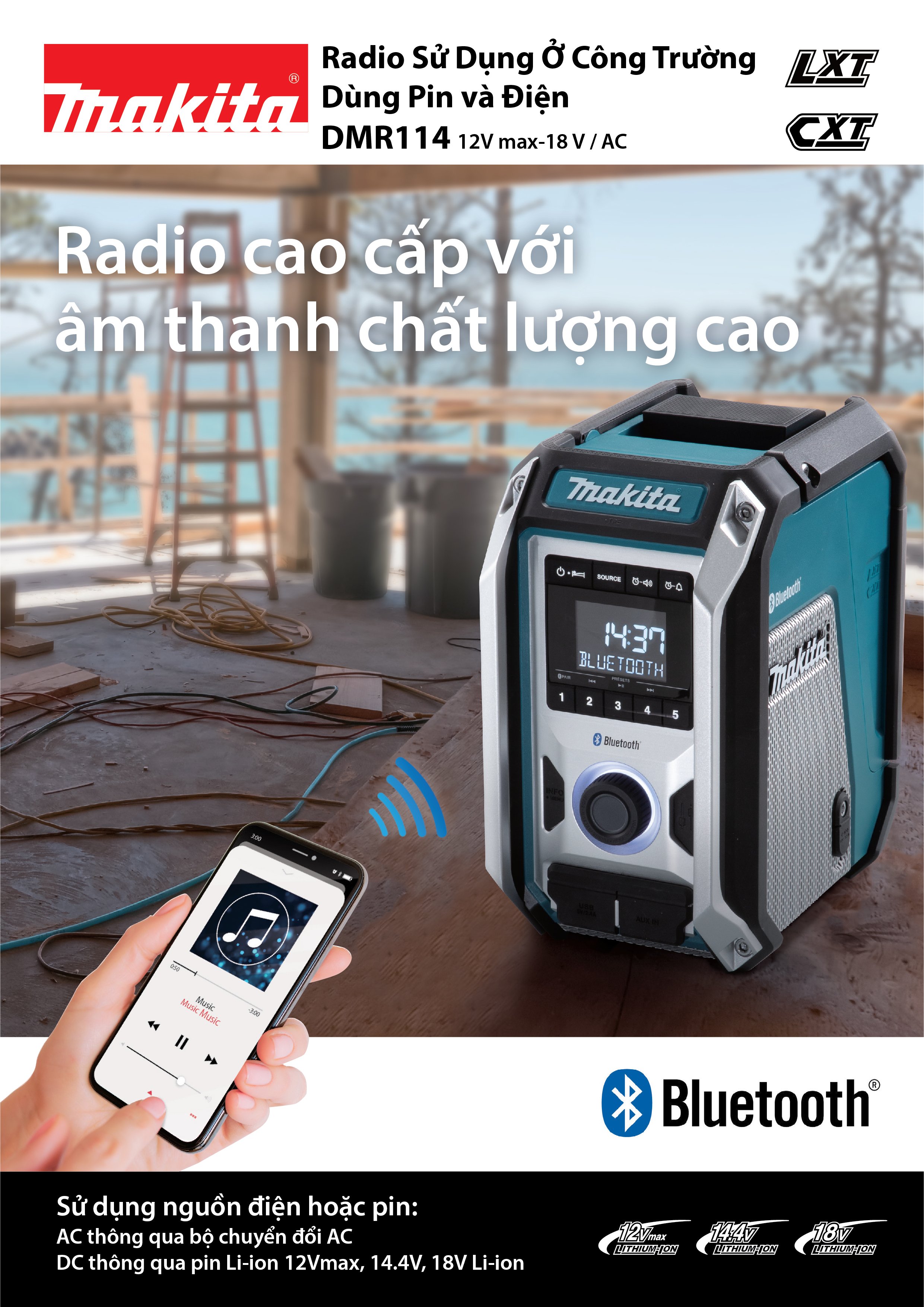 - Loa sử dụng được pin 12Vmax, 14.4V, 18V và adapter dùng nguồn điện xoay chiều 220V dùng. - Khả năng chống bụi và chống nước IP65 - Khả năng nghe Radio AM/FM - Hỗ trợ cài đặt ngày giờ và báo thức và hẹn giờ ngủ theo ý muốn. - Khả năng nghe nhạc phát qua Bluetooth kết nối qua điện thoại di động. - DMR114 trang bị 2 loa ở 2 bên và loa bass ở phía dưới cho chất lượng âm thanh tuyệt vời. DMR114 trang bị Cổng kết nối USB sạc điện thoại, zắc cắm 3.5mm để kết nối thiết bị phát nhạc khác và Zắc cắm nguồn DC12V để dùng nguồn điện 220V. - DMR114 được cài đặt sẵn 7 chế độ nghe nhạc tương ứng với 7 màu sắc đèn báo kahsc nhau như: + FLAT - Màu trắng + JAZZ - Màu Xanh Da Trời + ROCK - Màu Đỏ + CLASSIC - Màu Nâu + POP - Màu Hồng + NEWS - Màu Vàng + MY EQ - Màu Xanh Lục * Phụ kiện đi kèm: Adapter sài điện 220V (máy không bao gồm pin và sạc) - Thương hiệu: Makita Nhật Bản - Nước sản xuất: Trung Quốc - Bảo hành chính hãng 06 tháng trên toàn Quốc #dcsg #dmr114 #makita