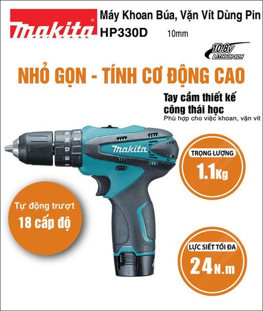 + HP330DZ thiết kế giành riêng cho khách hàng đã có pin và sạc 10.8V của makita và cần mua thêm thân máy để dùng chung pin và bộ sạc, nếu bạn vẫn chưa có pin và bộ sạc vui lòng liên hệ với Shop để được tư vấn mua trọn bộ sản phẩm bao gồm pin và bộ sạc nhé.