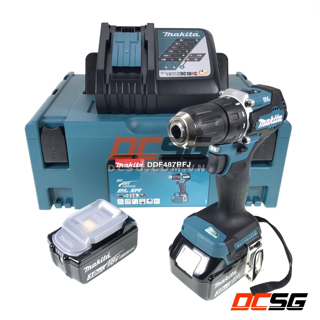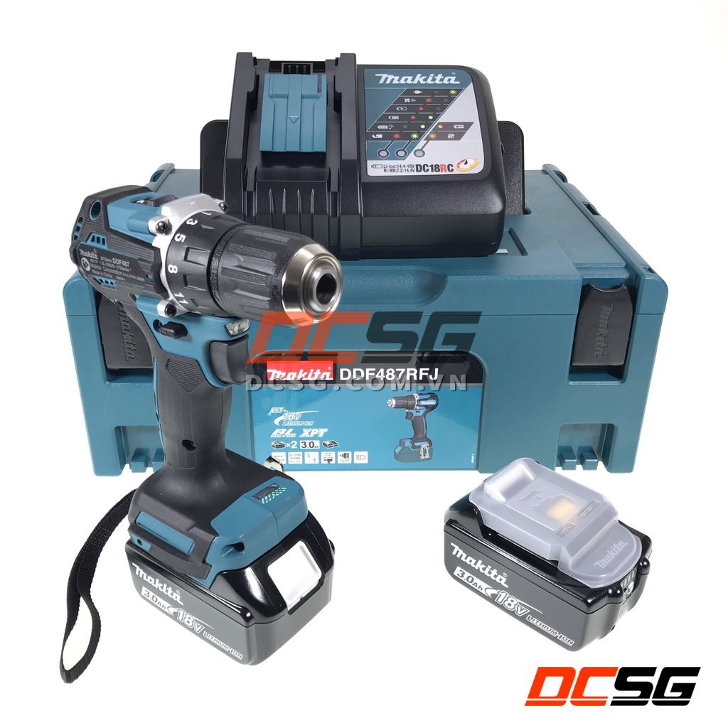 - Bộ sản phẩm bao gồm: Thân máy DDF487, 02 pin 18V 3.0Ah, sạc nhanh DC18RC, Thùng Makpac size 3.