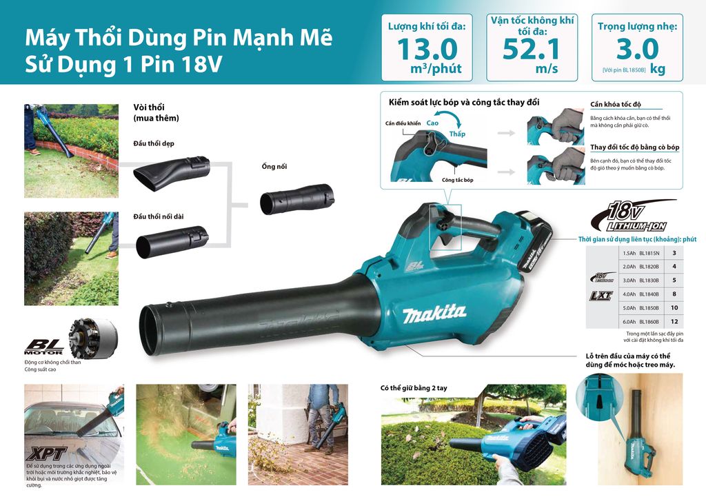 + Sử dụng liên tục: pin BL1860B / BL1850B: 12 / 10 phút