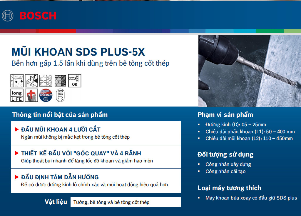 Theo Bosch, dòng SDS-Plus-5X “bền hơn tới 1,5 lần so với mũi SDS-Plus-1” khi khoan bê tông cốt thép.