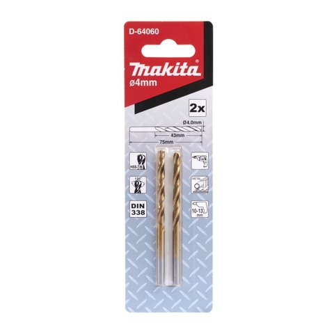 Dòng “economy” HSS-TiN của Makita: bao gồm các mã như D-64060 (Ø 4.0 mm), D-64082 (Ø 5.0 mm), D-64107 (Ø 6.0 mm), D-64141 (Ø 8.0 mm), D-64185 (Ø 10.0 mm), D-64222 (Ø 12.0 mm) theo bảng mã sản phẩm.