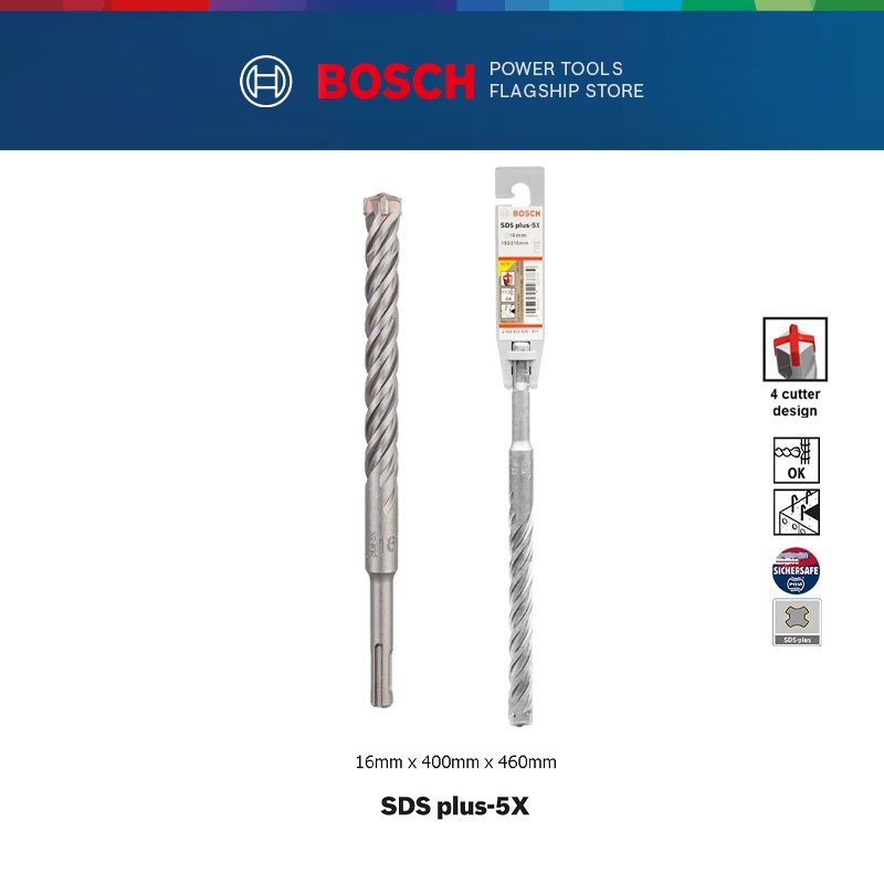 - Mũi khoan Bosch SDS-plus-5X được thiết kế đặc biệt với đầu định tâm để định tâm chủ động và chính xác trong bê tông. Chúng có hình dạng 4 lưỡi cắt giúp ngăn kẹt trong cốt thép và đầu mũi khoan không bị gãy. Chúng có thiết kế 4 lưỡi cắt để loại bỏ bụi nhanh chóng, mang lại tốc độ khoan cao hơn và tuổi thọ dài hơn.