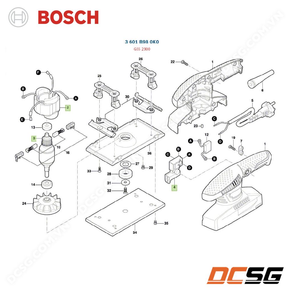 - Phụ tùng thay thế chính hãng cho máy chà nhám Bosch GSS2300 với các chi tiết được chia thành các phân loại sau: