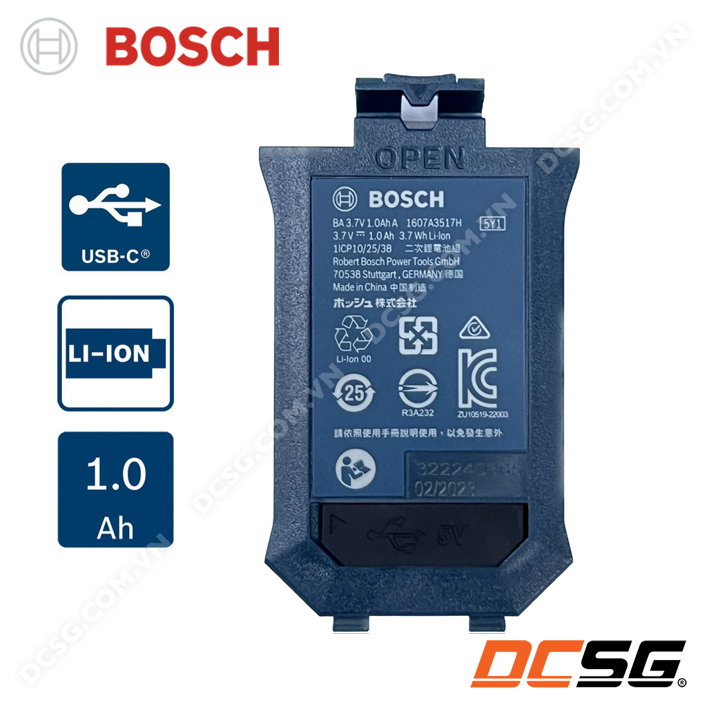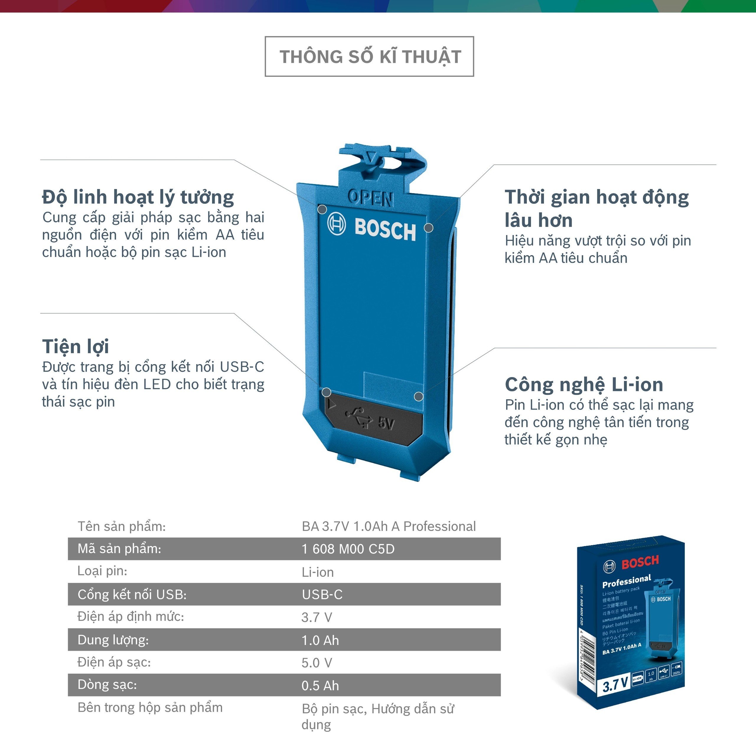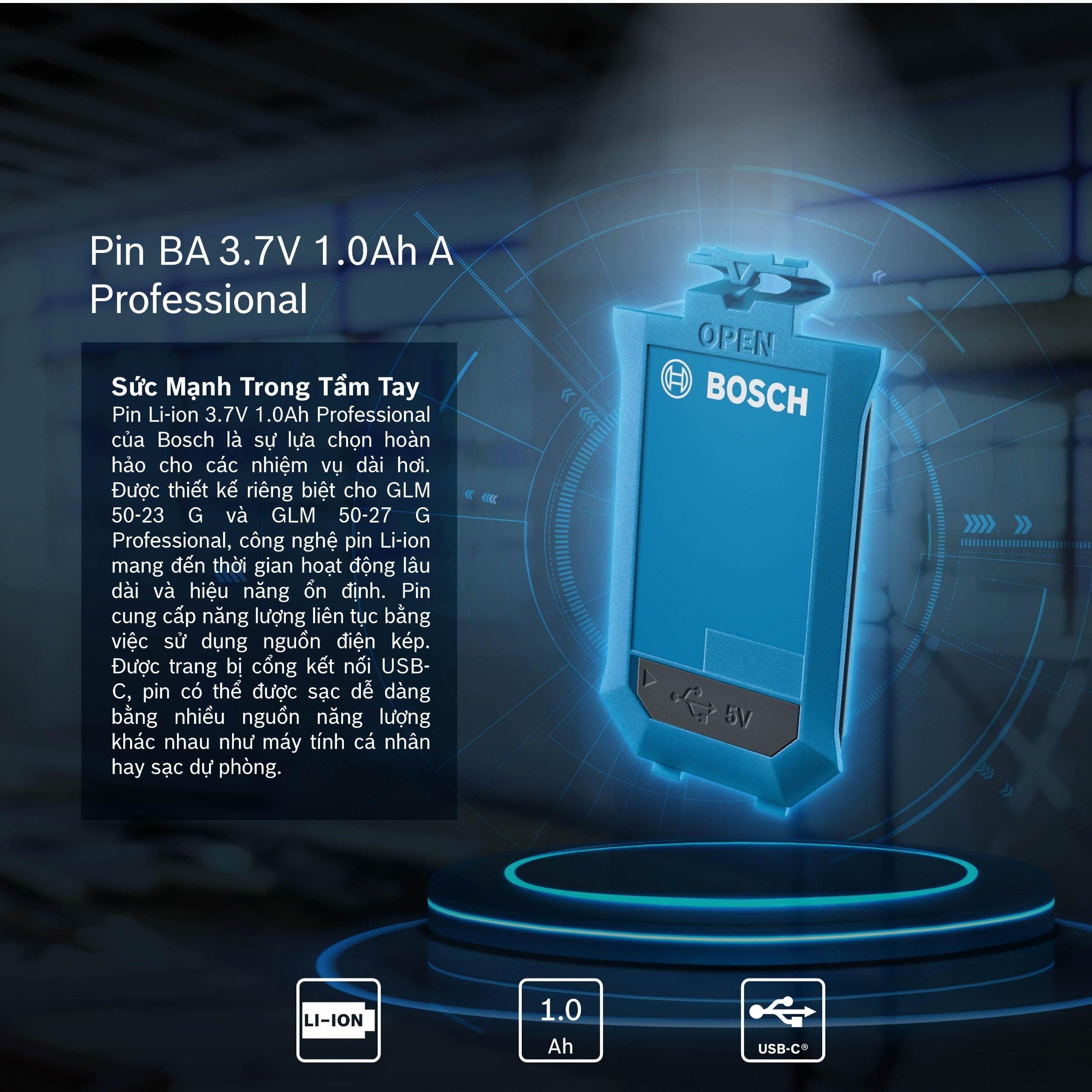 - Pin Li-ion BA 3.7V 1.0Ah A Bosch 1608M00C5D dùng để cấp nguồn cho các dòng máy đo khoảng cách tia xanh của Bosch như: GLM 50-23G, GLM 50-27G